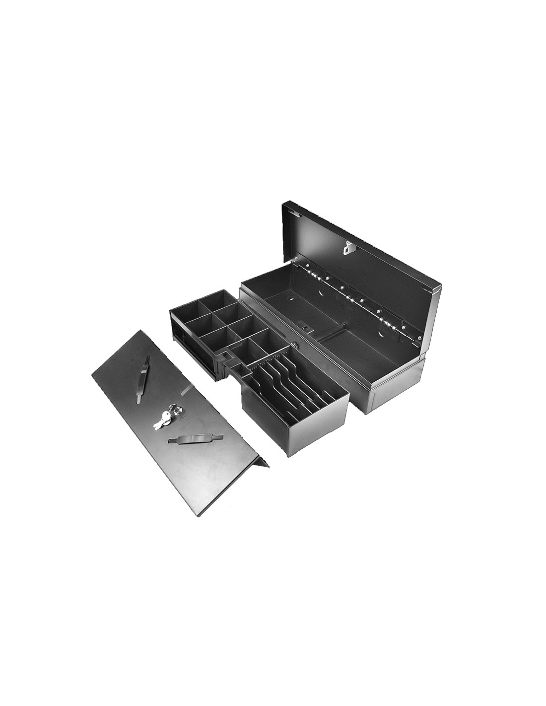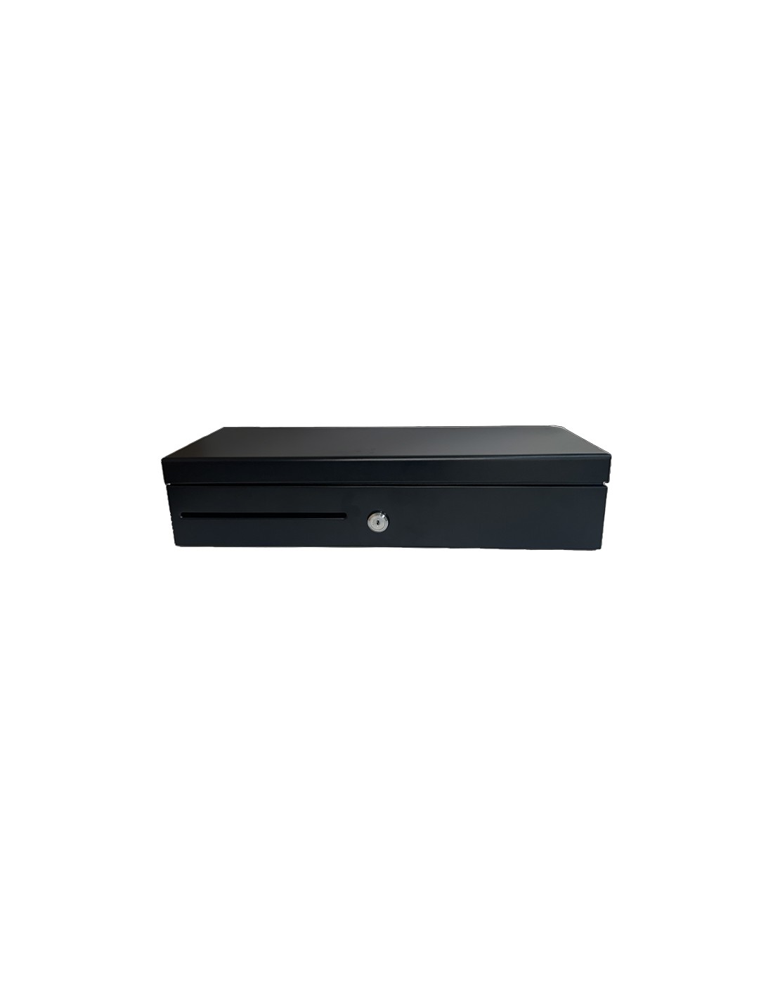 Cajón portamonedas automático de apertura vertical 46cm, 6 compartimentos para billetes, 8 gavetas para monedas, RJ12, 24V, negro.